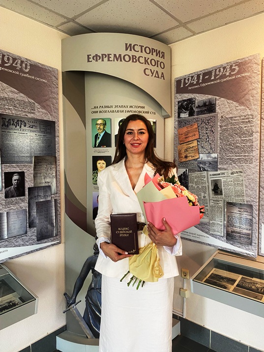 Постановлением Тульской областной Думы 8-го созыва от 17.07.2025 № 13/411 Королева Наталья Юрьевна назначена на должность мирового судьи судебного участка № 16 Ефремовского судебного района Тульской области. Сегодня председатель суда Шишков Н.А. представил коллективу мирового судью. В торжественной обстановке, в соответствии со ст. 8 Закона Российской Федерации «О статусе судей в Российской Федерации», Наталья Юрьевна принесла присягу. Николай Алексеевич поздравил начинающего судью с вступлением в должность, пожелал успехов в работе, а врученный экземпляр «Кодекса судейской этики», будет настольной книгой, как напоминание о высоких профессиональных и нравственно-этических требованиях, которым призван соответствовать судья. Ранее Королева Н.Ю. работала помощником судьи Центрального районного суда г. Тулы.