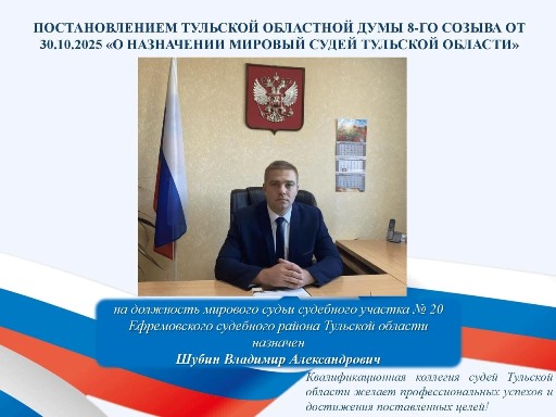 | О назначении мирового судьи судебного участка № 20 Ефремовского судебного района Владимира Шубина | версия для печати |